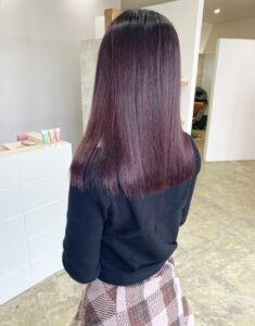 施術内容として、カラーはイルミナカラーを使用した中明度のカシス系のお色味にし、髪質改善で自然なストレートスタイルにさせていただきました。