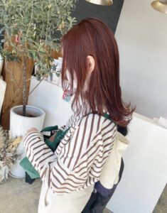 施術内容として、カットは顔周りにレイヤーをいれ、カラーはイルミナカラーを使用したピンク系のお色味に。