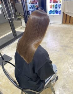 施術内容として、カットは毛先を整え、カラーはイルミナカラーを使用した高明度のブラウンベージュ系のお色味にし、トリートメントはオージュアエイジングケアライン”イミュライズ”を使用し、保湿感と艶感を与えました。