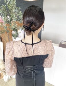 施術内容として、ミドル〜アンダーセクションに小振りなお団子にし黒のベロアリボンを添えた大人可愛いアレンジにさせていただきました。